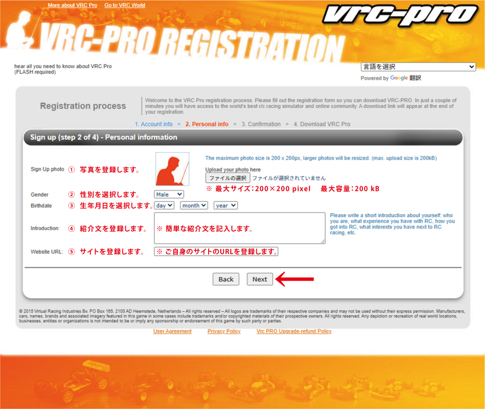 ・ 赤 矢印部 の 「 NEXT 」 を クリック し、次項目( Personal info : 個人情報 ) に 進みます。 |