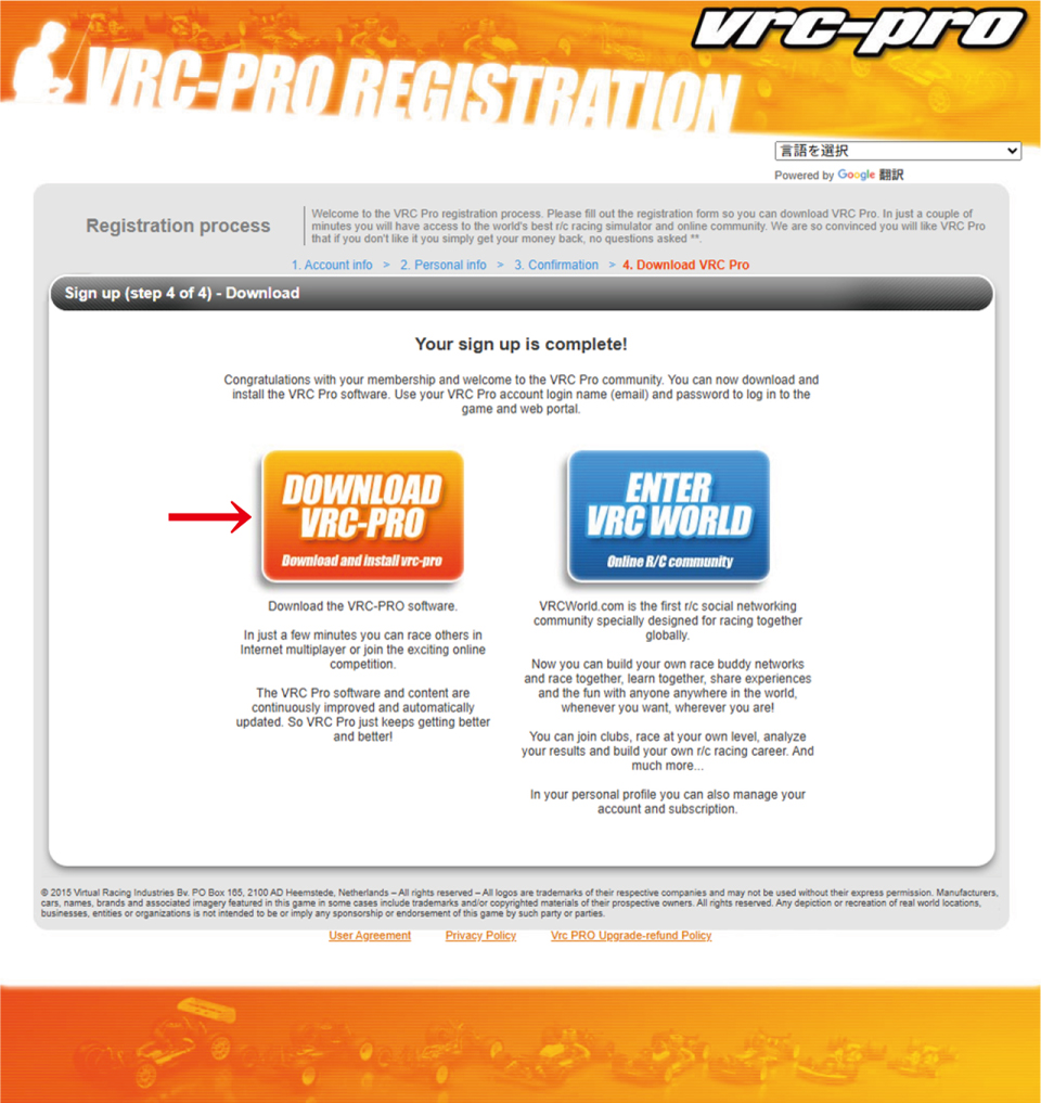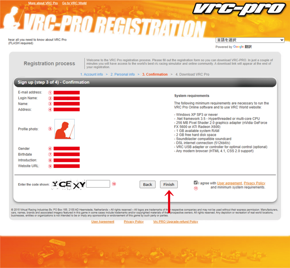 ・ 赤 矢印部 の 「 Finish 」 を クリック し、次項目( Download VRC Pro : VRC Pro を ダウンロード ) に 進みます。 |